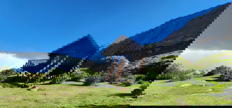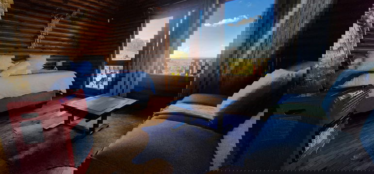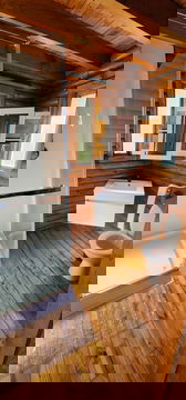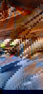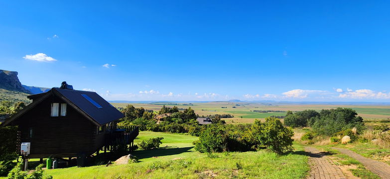 This is a wooden cabin with a steep stairway to access the chalet . The style of the cabin is open plan, with only the bathroom enclosed. There are two single beds on the loft (reached by ladder) and a double bed on the main level. (Loft not suitable for small children or elderly people). There is also a outside braai area with table and chairs. the wrap around deck provides incredible views of the farm and landscape and mountains.