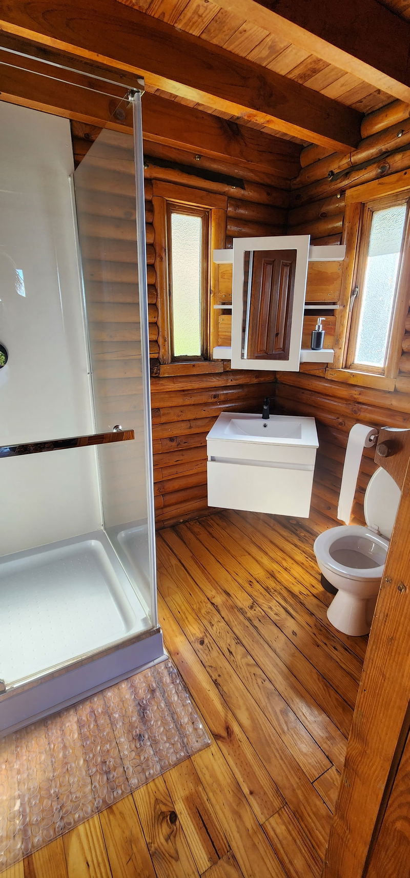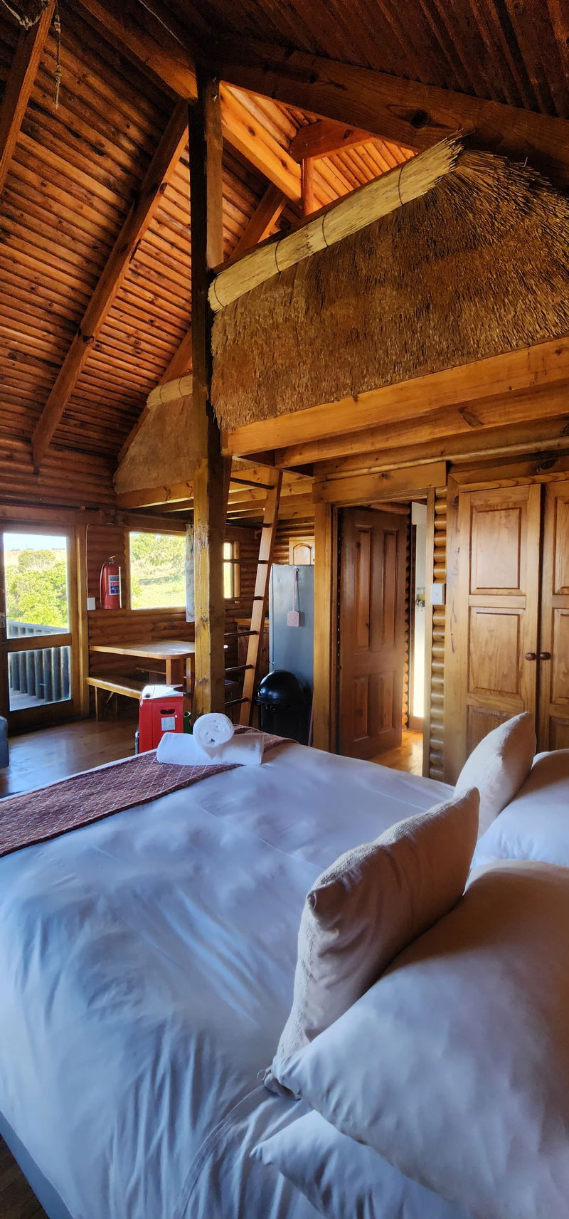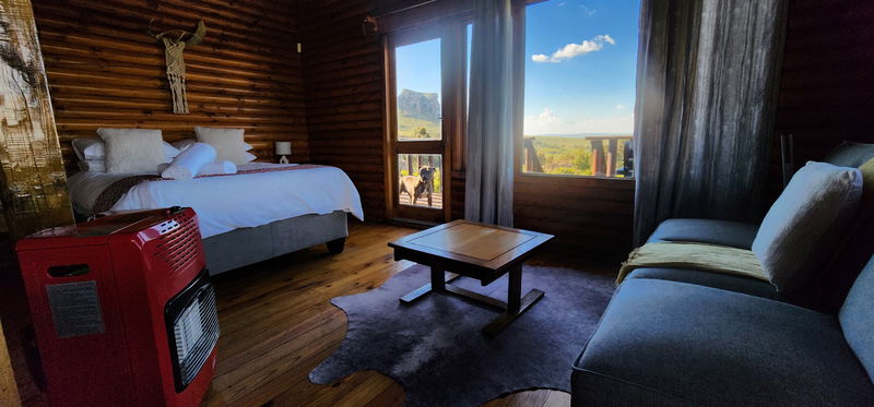 This is a wooden cabin with a steep stairway to access the chalet . The style of the cabin is open plan, with only the bathroom enclosed. There are two single beds on the loft (reached by ladder) and a double bed on the main level. (Loft not suitable for small children or elderly people). There is also a outside braai area with table and chairs. the wrap around deck provides incredible views of the farm and landscape and mountains.